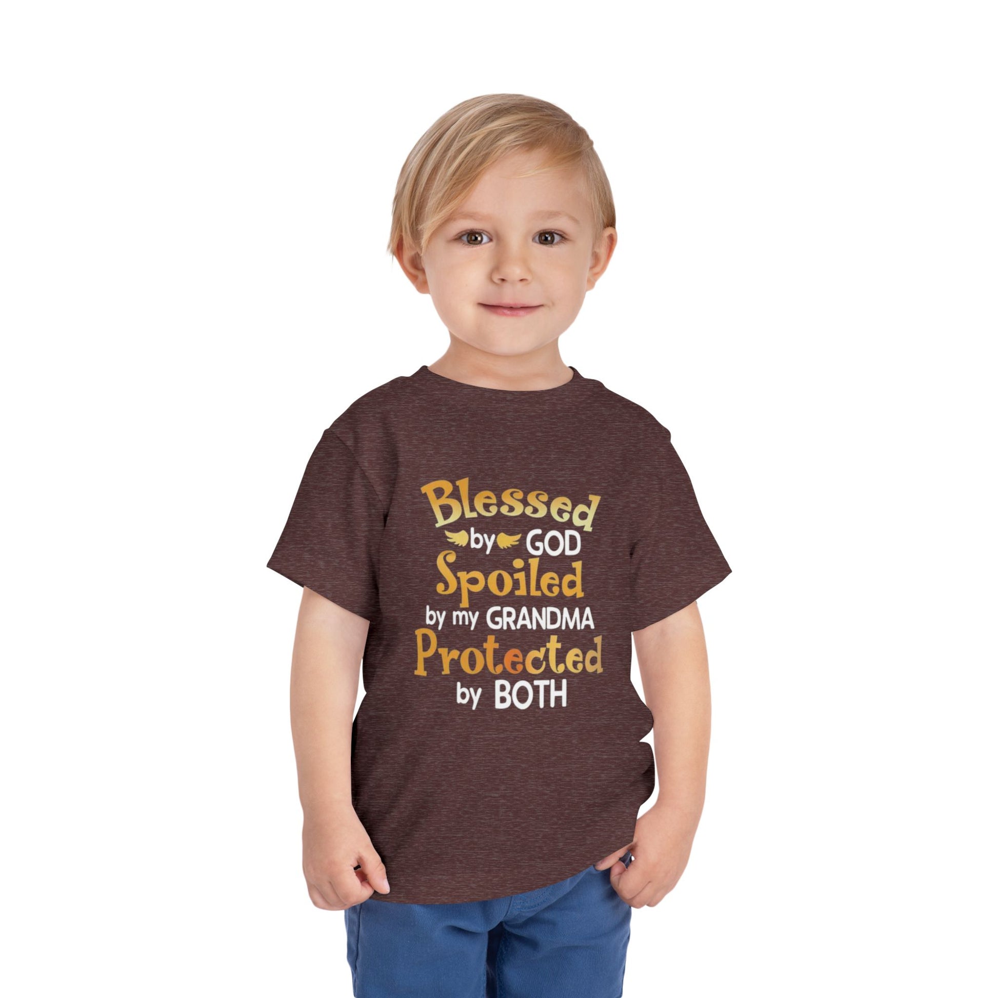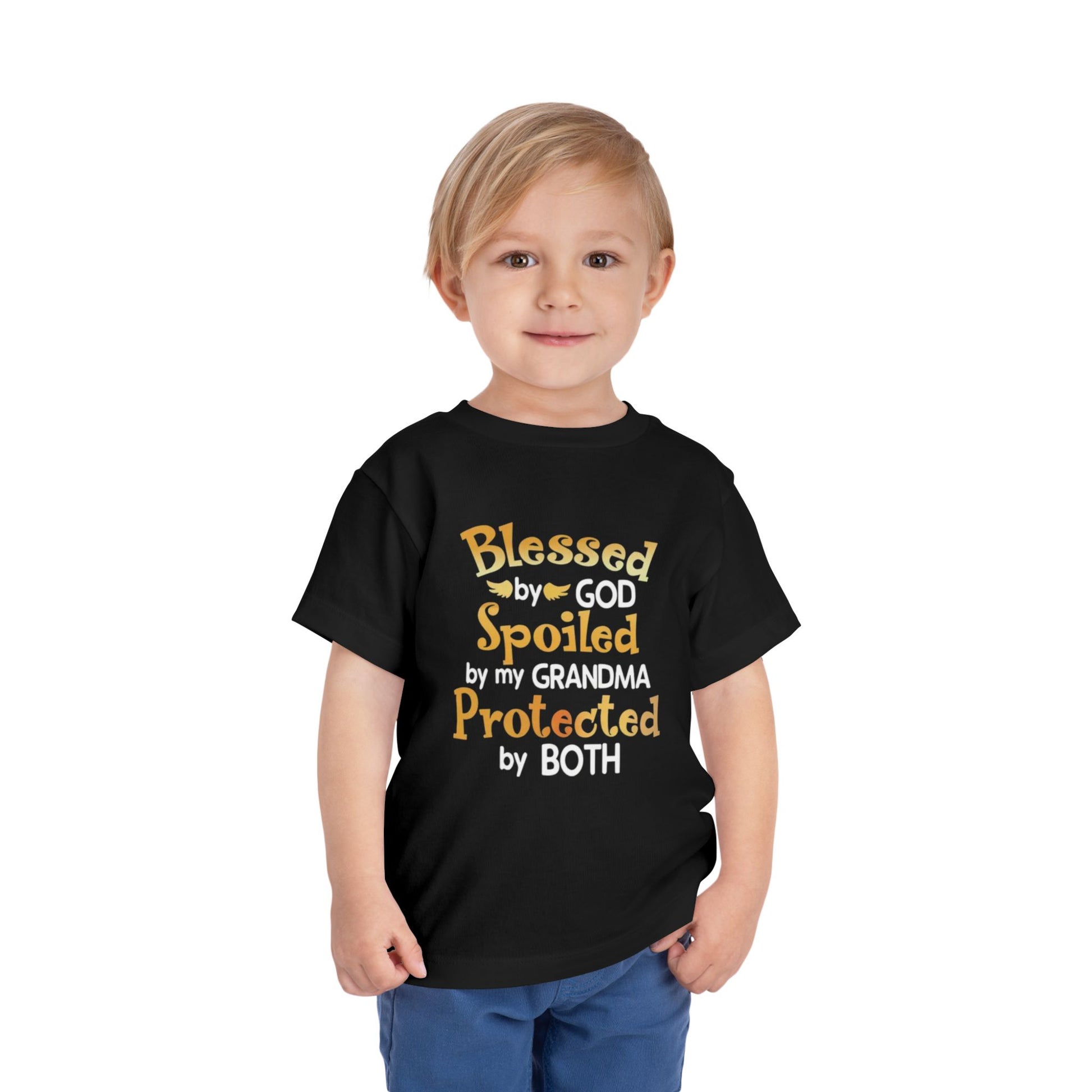 Blessed by God Spoiled by Grandma Protected by Both Toddler T Shirt Christian Baby Tee Grandparent Gift Kids Faith Shirt Cute & Funny Outfit