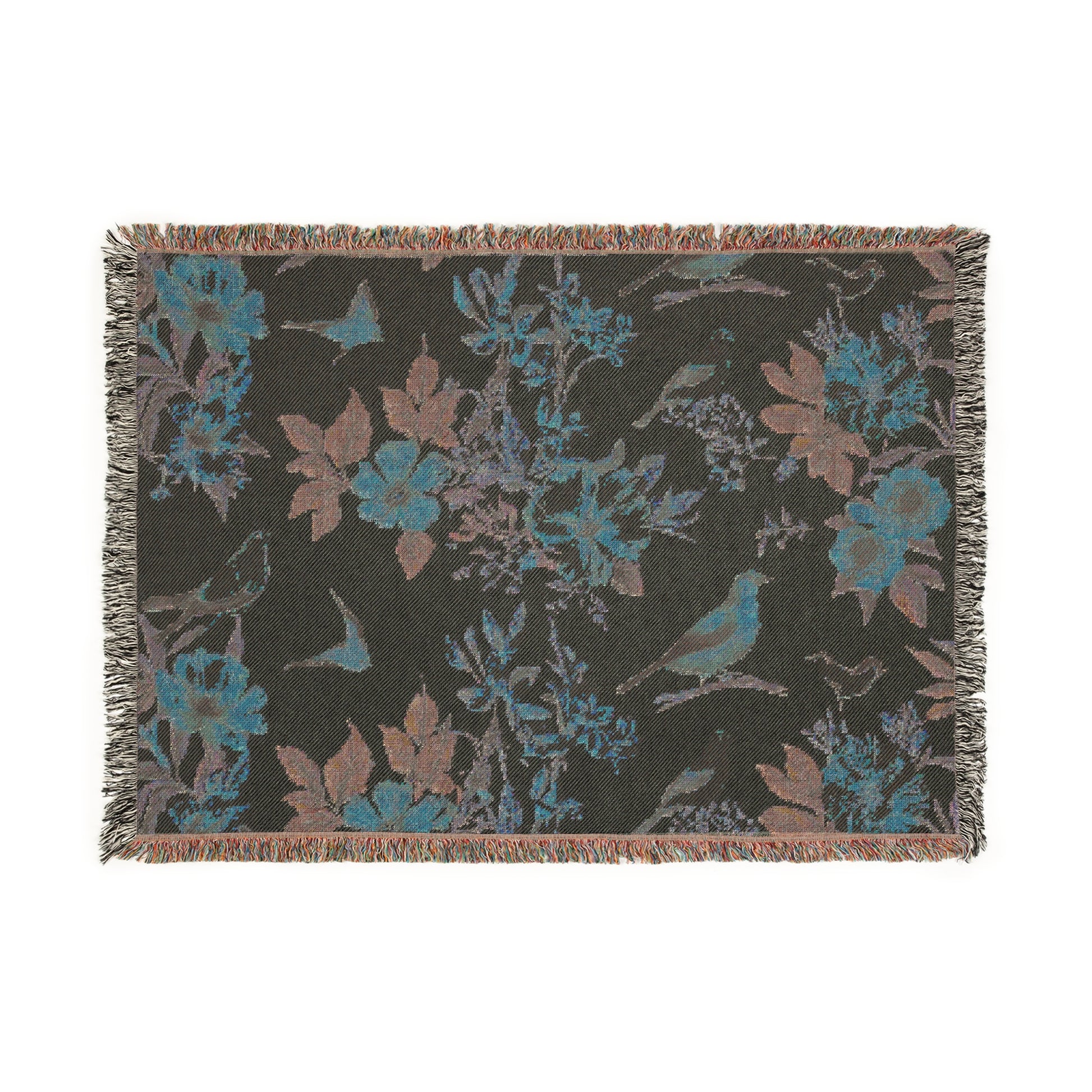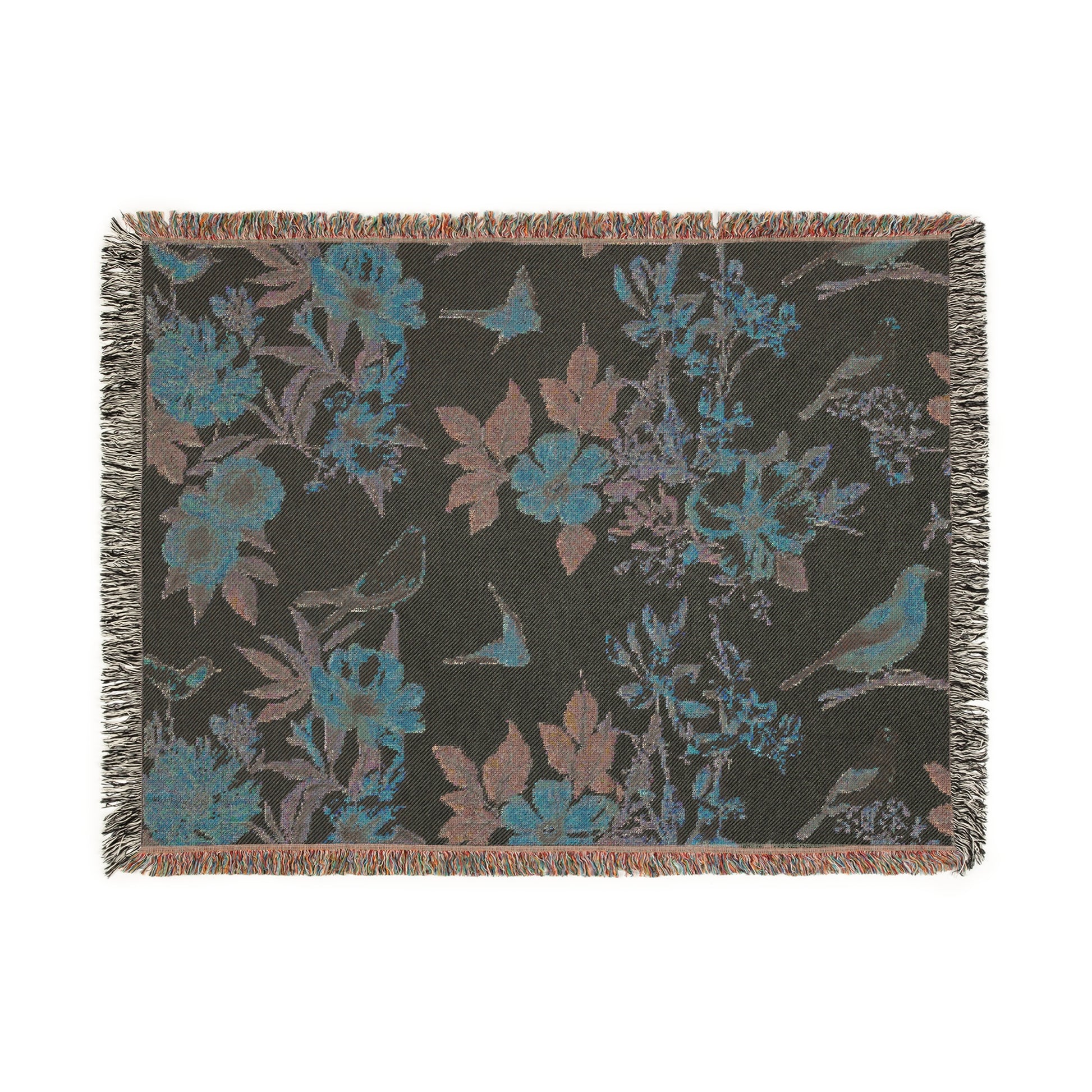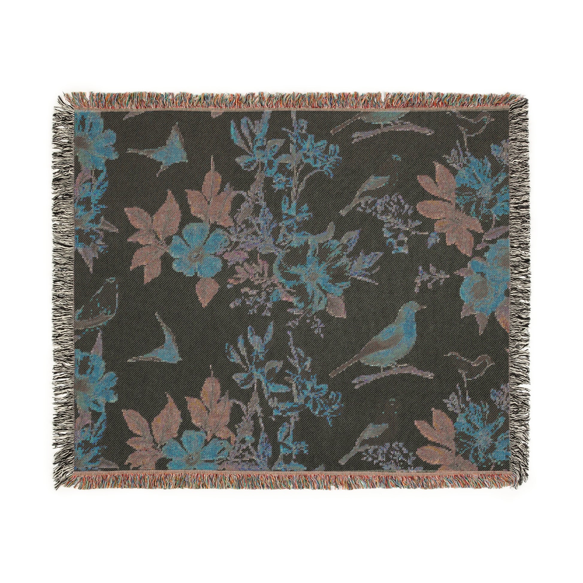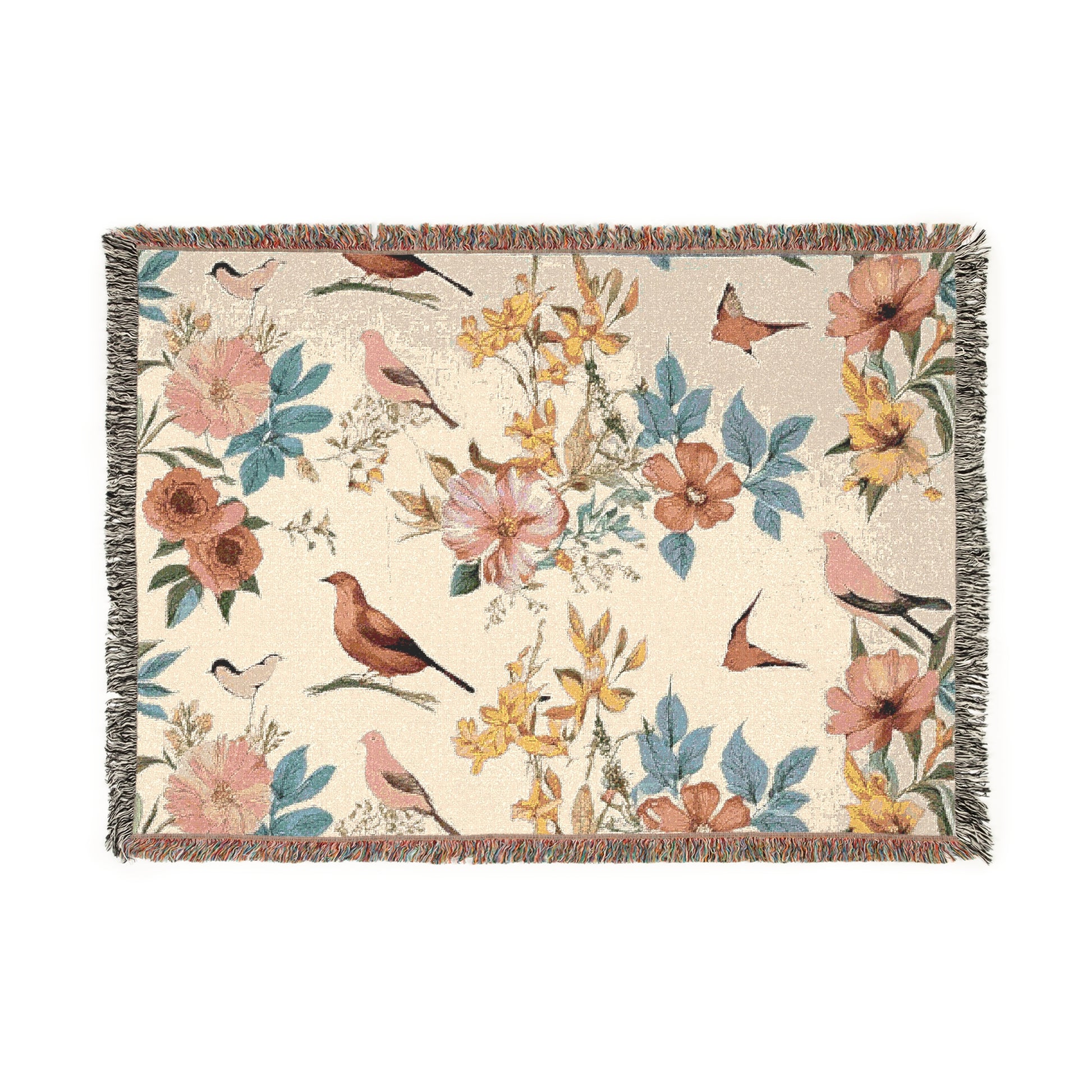Woven Blanket - Bird & Floral Throw, Lightweight Cozy Decor, Beige Black Handmade Gift, Soft Blanket, Home Accent, Bird Lover Gift, Floral